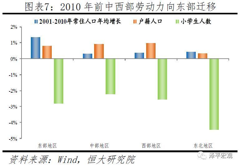 1978-2010年,从中西部迁往东部地区的人口以劳动力为主,并且多数未迁户籍、也未带子女,中西部留守儿童现象非常明显。改革开放后,人口大量向经济率先发展的东部地区集聚,1978-2010年东部、中部、西部、东北地区常住人口分别年均增长1.39%、0.86%、0.85%、0.73%,常住人口占比分别变化4、-1.5、-1.7、-0.8个百分点。但东部地区户籍人口、小学生数并未随常住人口大幅增长,东部、中部、西部、东北地区户籍人口分别年均增长1.06%、1.14%、1.10%、0.69%,户籍人口占比分别变化0、0.7、0.3、-1个百分点;东部、中部、西部、东北地区小学生数分别年均增长-1.12%、-1.11%、-1.03%、-2.60%,小学生数占比分别变化0.8、0.8、1.6、-3.2个百分点。