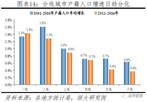 在2010年后,随着户籍制度改革深入推进,分线城市户籍人口增速的梯度分化显化,2011-2016年一二三线户籍人口年均增速分别为1.4%、1.3%、0.9%,而同时期常住人口年均增速分别为1.5%、1.3%、0.8%,一线城市因严控户籍导致户籍人口增速稍低于常住人口,二线城市户籍人口增速持平于常住人口,而三线城市户籍人口年均增速已高于常住人口。2017年初城市“抢人”大战火热展开,二线城市户籍人口增速有望进一步上升。四五六线户籍人口年均增速分别为0.7%、0.4%、0.4%,对应的常住人口增速分别为0.6%、0.2%、0.3%;其中五六线城市户籍人口增速较2001-2010年明显下滑,表明在外出人口有所回流的同时户籍人口明显外流。