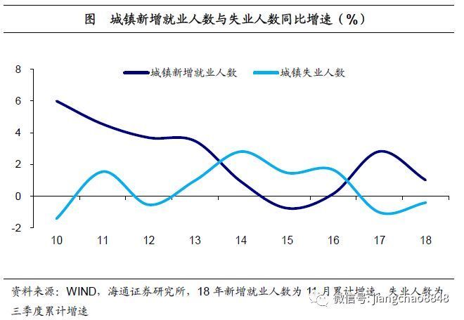 新增就业增速放缓,失业增速触底回升。人社部和统计局对就业统计的另一类重要指标即是就业和失业人数,一般来说,两者之间存在着反向变动的关系。18年11月城镇新增就业人数累计值虽然创下13年以来的同期新高,但累计增速只有1%左右,较17年城镇新增就业2.8%的增速水平有明显的放缓。此外,从失业人数上来看,18年3季度城镇失业人数仍较17年同期减少,但同比增速仅-0.4%,比17年底的增速降幅也有明显收窄。