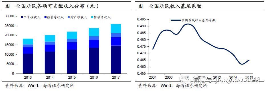 就业转弱拖累收入。工资收入是居民收入最主要的组成部分,就业下滑对居民收入将造成很大冲击。根据统计局调查,2017年我国居民人均可支配收入2.6万元,其中工资性收入接近1.5万元,占总收入比重超过一半,而转移净收入和财产净收入占比分别为18%和8%。所以对于失去工作的人来说,没有工资收入将极大地影响整体收入水平。
