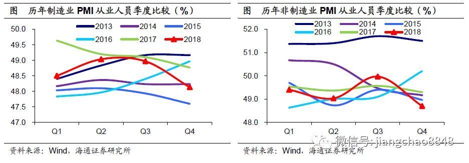 去产能对制造业用工影响较大。对制造业的子行业做以进一步区分,我们发现,在从业人数普遍回落的大背景下,中游原材料行业的收缩幅度更为明显,18年11月规模以上中游原材料类制造业企业,每家平均的从业人员数量增速跌幅要比17年扩大超过8个百分点,而中游加工组装类制造业行业和下游行业跌幅仅扩大5-6个百分点。中游原材料类制造业从业人员数量的下滑主要同去产能有关,像受到去产能政策影响较大的有色、水泥行业平均每家企业用工人数18年增速跌幅均较17年扩大10个百分点以上,但钢铁行业由于企业数量较从业人员数量收缩程度更大,因此18年平均每家规模以上企业的从业人员数量较17年不降反升。