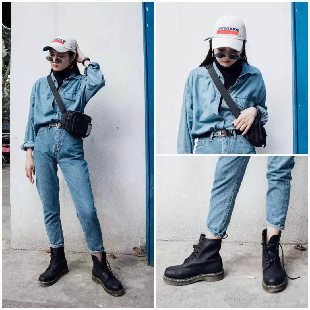 如果穿宽腿裤or工装裤,那么!!请把马丁靴当袜靴一样,使劲勒鞋带,保证脚踝纤细,就不会显粗!