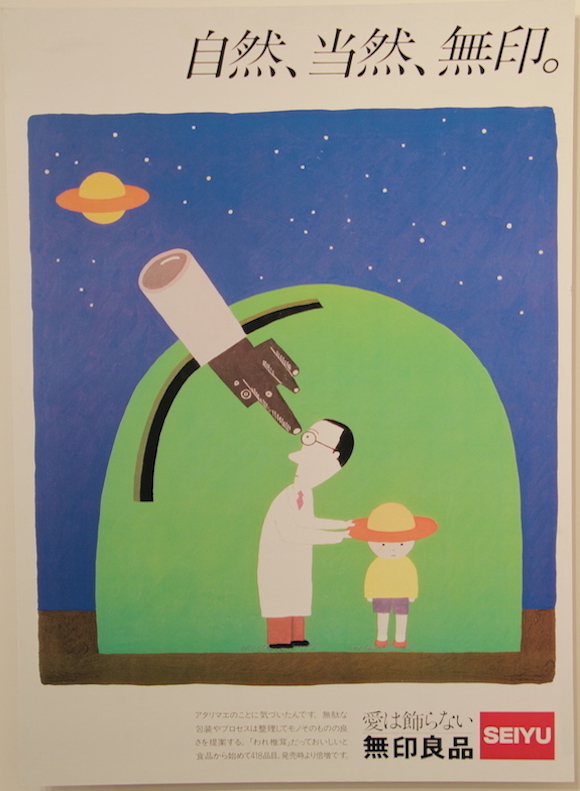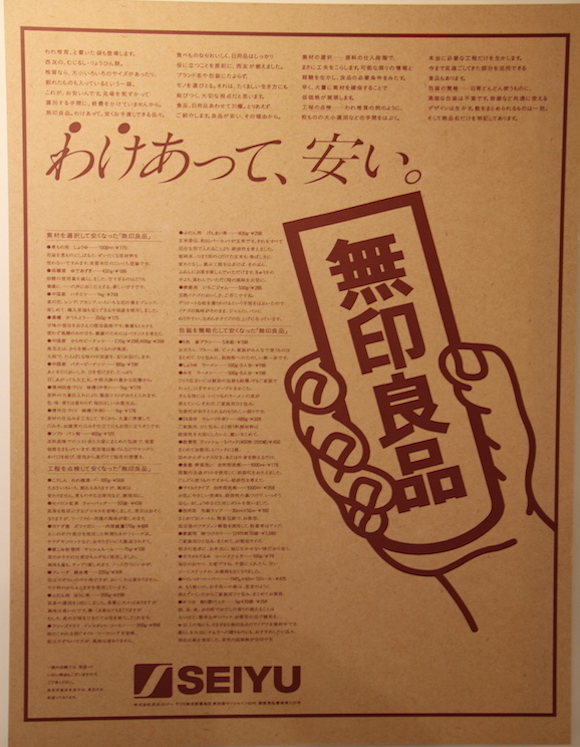 另外,请注意看海报下方SEIYU的英文字样。SEIYU(西友)就是无印良品当时的母公司,专门从事百货商场业务。这种从属关系一直持续到了1990年,那一年SEIYU出让了无印良品的经营权。而在1983年东京青山第一家无印良品独立店面开出前,这个品牌在全日本的销售场所就是SEIYU百货里的柜台。所以,看见海报上是否有SEIYU字样,也能大致对这个海报的年份以及设计背景有个判断。