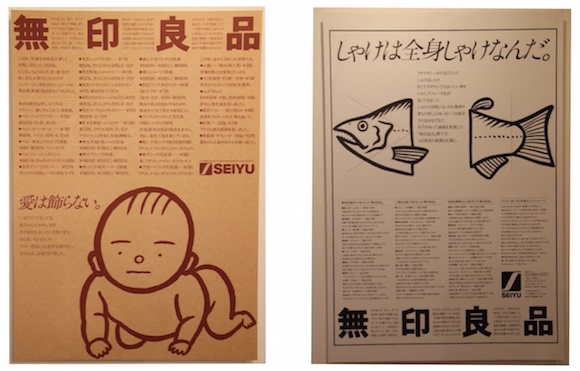 1981年:之后,田中一光、小池一子搭配山下勇三就成了无印良品早期海报制作的黄金组合。1981年的“爱无需美化”以及“三文鱼全身都是三文鱼”也是他们的作品。前者是当年非食品类别产品的宣传海报,诞生在无印良品刚出童装产品线的时候,于是海报上有了婴儿插画,而背后密密麻麻的小字里则多了儿童服装商品的信息。