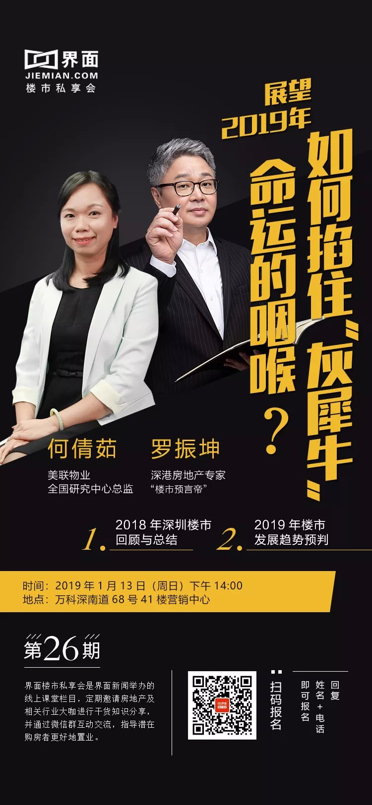 1月13日,界面楼市年终私享会重磅来袭,特邀深港房地产专家、楼市“预言帝”罗振坤,美联物业全国研究中心总监何倩茹,助你看清国际大环境中的“灰犀牛”,把握买房的好时机!