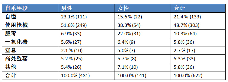 美国阿克伦大学的社会学教授瓦莱丽•卡拉南1997-2006年间俄亥俄州萨米特郡的621起自杀死亡案件做了分析,他发现,选择自杀的男性会更倾向于使用枪械自杀,因为枪械是最致命、最快捷的自杀方式。