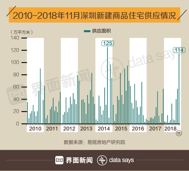 从供应端看,深圳新房供应正在加大。2018年11月深圳新建商品住宅供应面积为114万平方米,回顾之前的18年,2018年11月的供应面积仅次于2014年9月份供应的125万平方米,为历史第二高值。