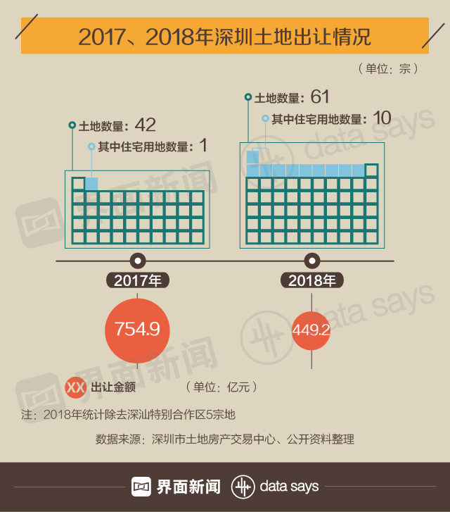 虽然土地供应量上去了,但是2018年深圳全年土地出让金额仅为449.2亿元,不足2017年6成。