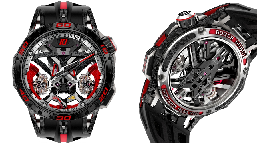 Excalibur One-Off算是一款复杂功能的概念腕表,灵感来源于兰博基尼概念车SC18 Alston。从红黑相间的颜色配置,到表盘造型,你能发现罗杰杜彼Excalibur One-Off跟兰博基尼SC18 Alston有很多相似之处。比如说左右两侧陀飞轮机芯放置的位置像跑车的大灯轮廓,表盘轮廓模仿了跑车的轮胎造型,还有腕表的背面骨架,跟跑车模型如出一辙。