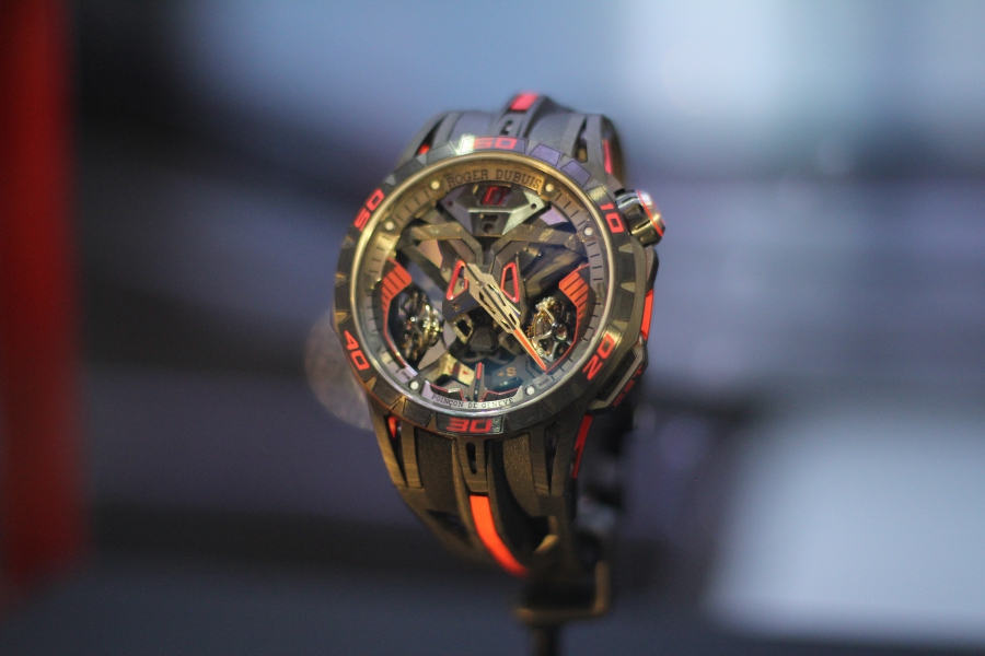 当然,罗杰杜彼的重点不在跑车本身,而是跑车上方展示的“镇店之宝”罗杰杜彼Excalibur One-Off腕表。这款腕表也是全球仅有一枚的孤品,价值约700万人民币。那它到底贵在哪里呢?