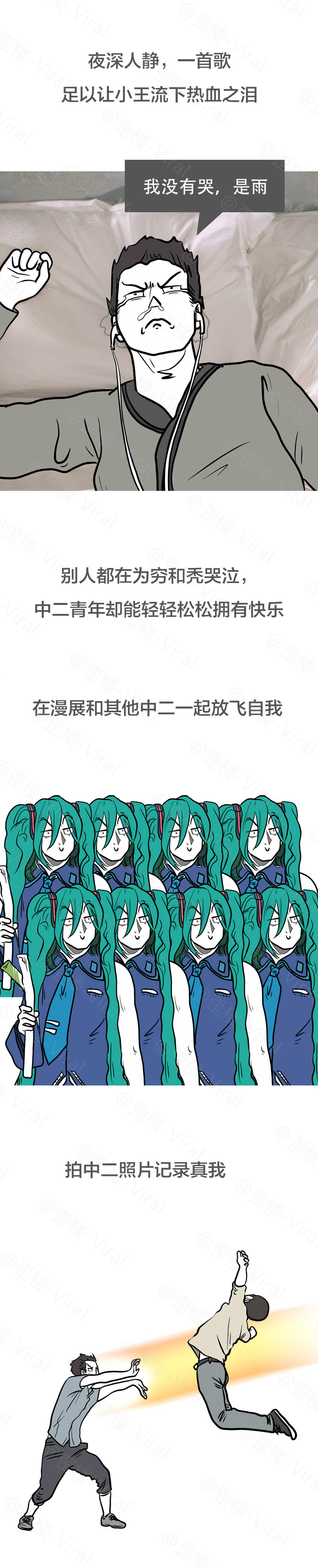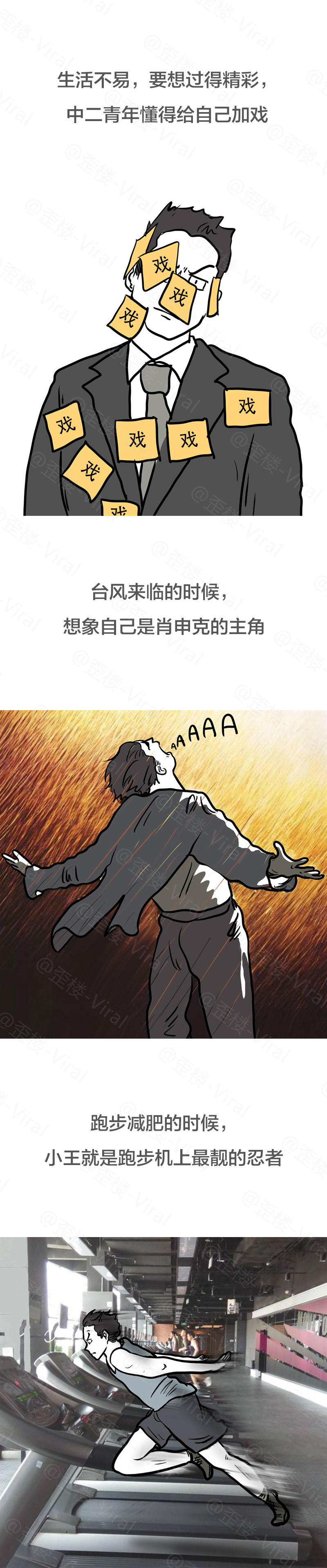 每个人都是潜在的中二患者,大家之所以会把自己中二的内心封闭起来,是因为弱者需要别人的认可,而真正的强者都是离群索居的,所以中二才会被排斥。说到底,错的不是中二的我,而是这个世界!