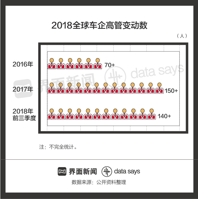 2018年底,包括通用、福特在内的多家知名车企都被曝出裁员的消息。高管层面,仅2018年前三季度就有超过50家车企对140余位高管的岗位做出调整,接近2017年全年变动总数。