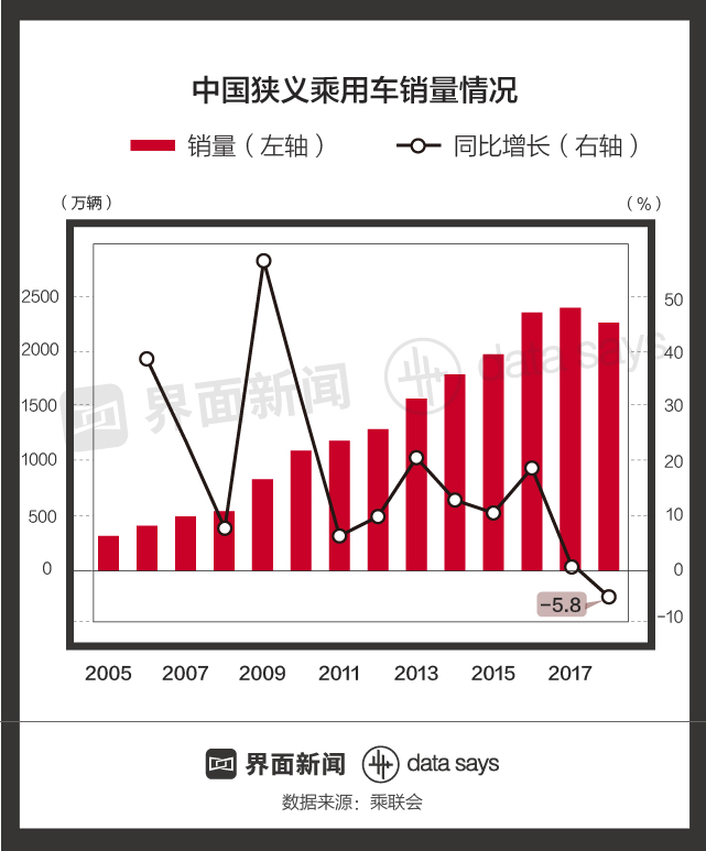乘联会数据显示,2018年中国狭义乘用车销量同比下降5.8%,为28年来首次下滑。