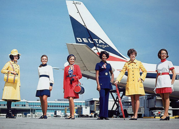达美第一套裤装制服登场。海军蓝喇叭裤在70年代很时尚,也不再需要帽子的搭配了。裙装有百褶迷你裙和橙色的束腰外衣、和蓝白套装几款,主要为了呼应波音747的新机型。客舱服是明黄色,配饰是蝴蝶结贝雷帽、带有金属硬件的皮革高跟鞋,番茄红的外套和黄色雨衣,还有黄色的手包、钱包,配有黄、白、蓝三色肩带。
