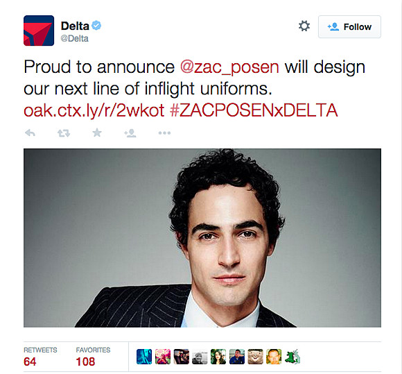 美国达美航空已于上周正式宣布了委托Zac Posen改造公司制服的决定。这位今年35岁的设计师,将为达美航空大约6万名员工设计制服。本次制服改造计划不仅针对通常最受关注的空乘人员,还包括消费者服务人员和地面支持人员。但Posen目前对于最终会呈现多少套风格还不太确定,只透露了大致的范围是50种。这个设计量,已经抵得上一场大型时装秀的规模。