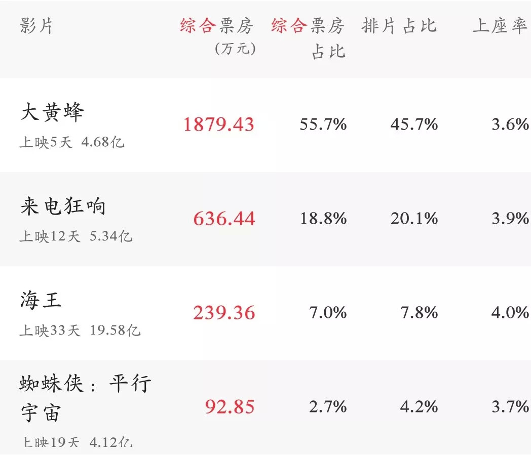 从现在来看,《大黄蜂》的上涨势头已经开始下滑,上座率一直在5%左右,并没有比《来电狂响》或者已经上映多时的《海王》高多少,空有50%的排片率而无法爆款。