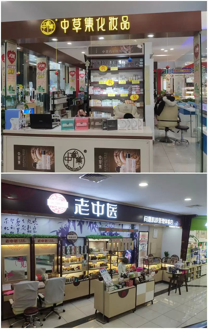 在县城走访时,听到美导说的最多的一句话就是“这款产品是纯植物的,很安全,对皮肤很好的”。形成对应的是,除了中草集、老中医的装修是以褐色为主色调以外,其他单品牌店的装修多以绿色为主。