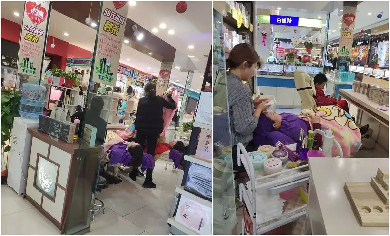 以山东省滕州市贵诚购物中心为例,商场内温碧泉、百雀羚、英树等专柜鲜有顾客,稍显冷清,但同在该商场的樊文花、中草集专柜却座无虚席,一个约20平米左右的门面,共有3张躺椅,每个月创造着超过10万元的营收。据该商场与樊文花只有一个过道之隔的某专柜BA透露,“樊文花店里一天都不间断有人来。”