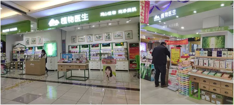 但植物医生早在几年前便在其品牌创始人解勇的带领下,走上了从店中店,到独立的街铺,再到社区店的开店战略。从品牌的长远发展来看,摆脱对百货商城和购物中心的“依赖”,确实对品牌实现独立扩张有利。在安徽和山东县城的植物医生门店,街铺与百货商场店中店的比例几乎各占一半。