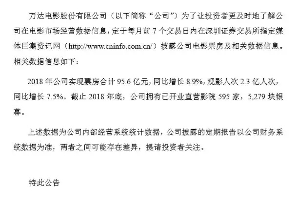 1月9日,万达电影发公告称,2018年全年实现票房合计95.6亿元,同比增长8.9%,观影人次为2.3亿人次,同比增长7.5%。截止2018年底,万达电影拥有已开业直营影院595家,5279块银幕。