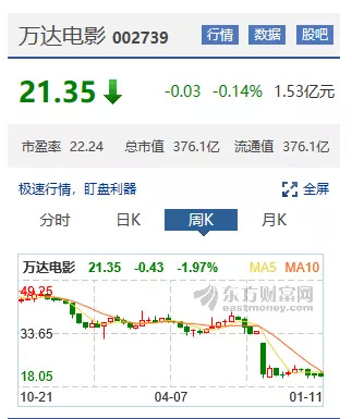 另外的一大连锁反应就是重新开盘后万达电影的股价。股价从停牌前的34.56元,跌至昨天收盘的21.35元,市值蒸发228亿元,相较于2016年49.25元的峰值,算是腰斩还多。