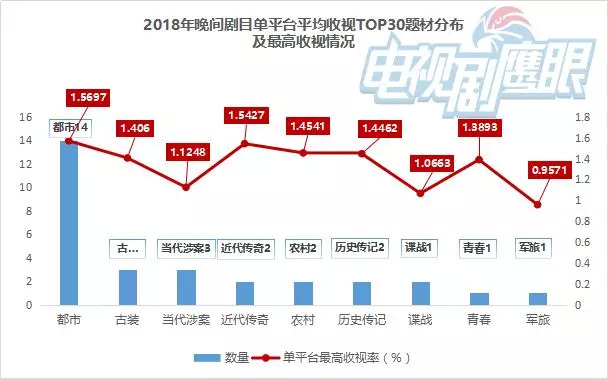 从2018年全年CSM52城央卫视晚间剧场单平台平均收视TOP30来看,都市剧共计14部,是榜单中所占比重最大的题材。与此同时,在TOP30榜单中,有26部剧目的单平台平均收视破1,而都市剧以13部作品、50%的占比优势,居于首位。其中《恋爱先生》以1.56%的单平台平均收视成绩,拿下2018年央卫视晚间剧目的收视冠军。