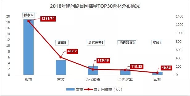 从央卫视晚间剧目的网播量上来看,都市剧的表现依旧抢眼。在2018年晚间剧目网播量TOP30中,都市剧占据了“半壁江山”,以17部作品、累计1289.74亿次的网播量高居首位。
