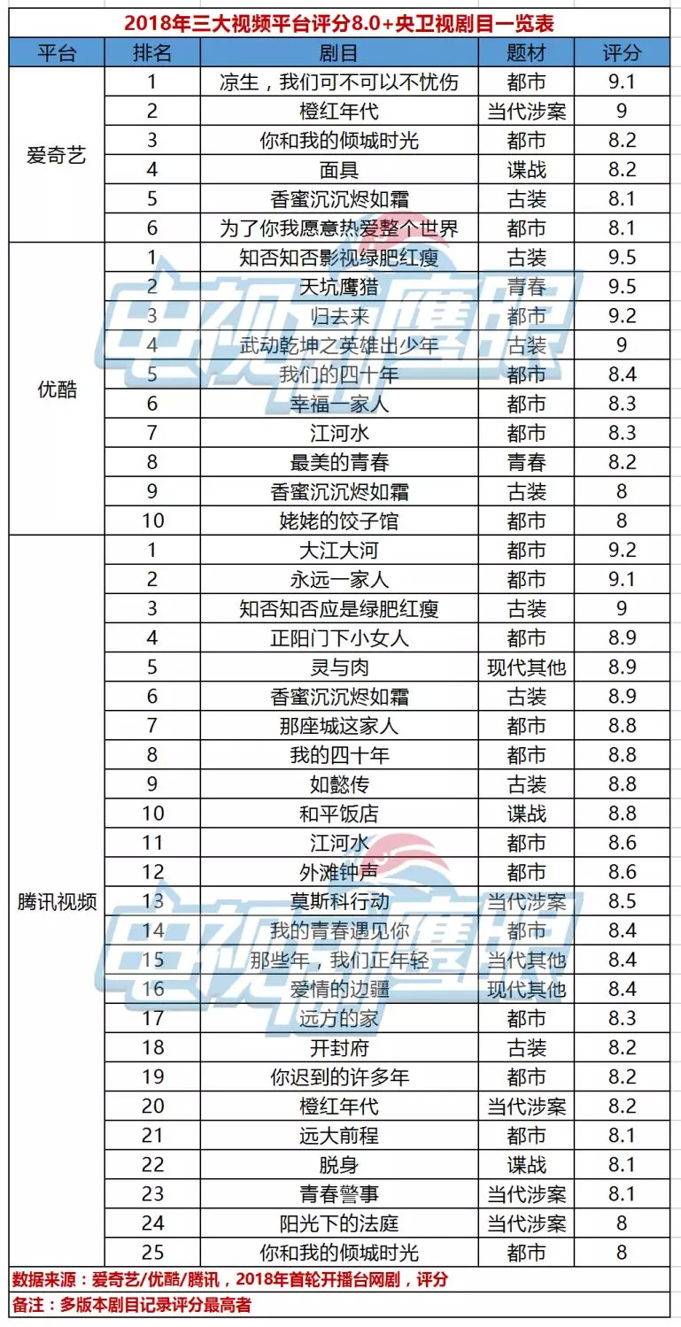 在三大视频平台的评分为8.0+的央卫视剧目中,都市剧均占据上风,爱奇艺、优酷、腾讯视频上的比重分别为50%、50%、48%。更为重要的是,都市剧目还强势拿下三个冠军剧目中的两个席位,分别是爱奇艺平台上评分达9.1分的《凉生》,和腾讯视频平台上评分达9.2分的《大江大河》。