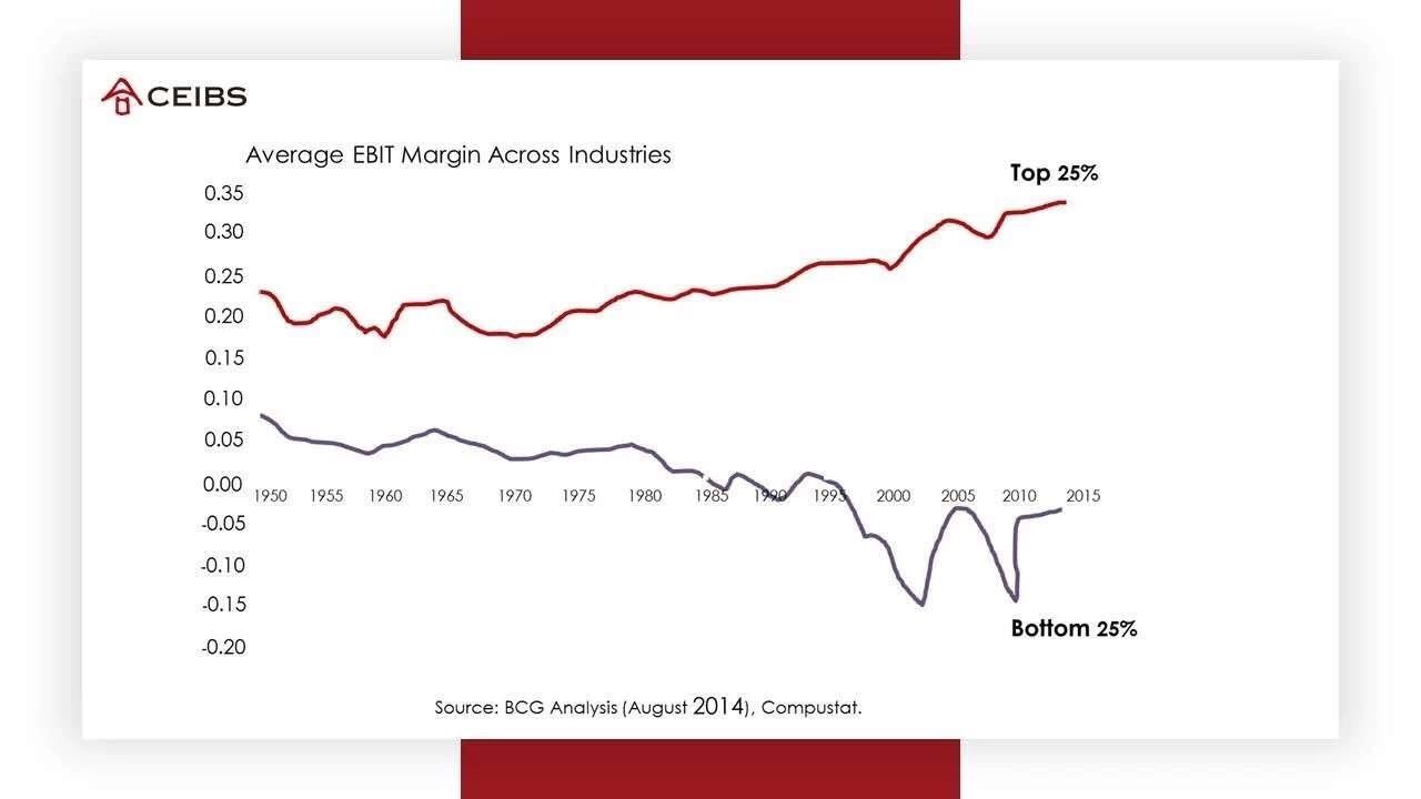 第二组数据源自相同的样本,但换了一个侧重指标:运营利润率——扣除掉财务成本和税务之前的运营利润率,它反映了企业运营的收益率。我们从中拿出样本头部25%和尾部25%的公司对比,发现一个有趣的现象: