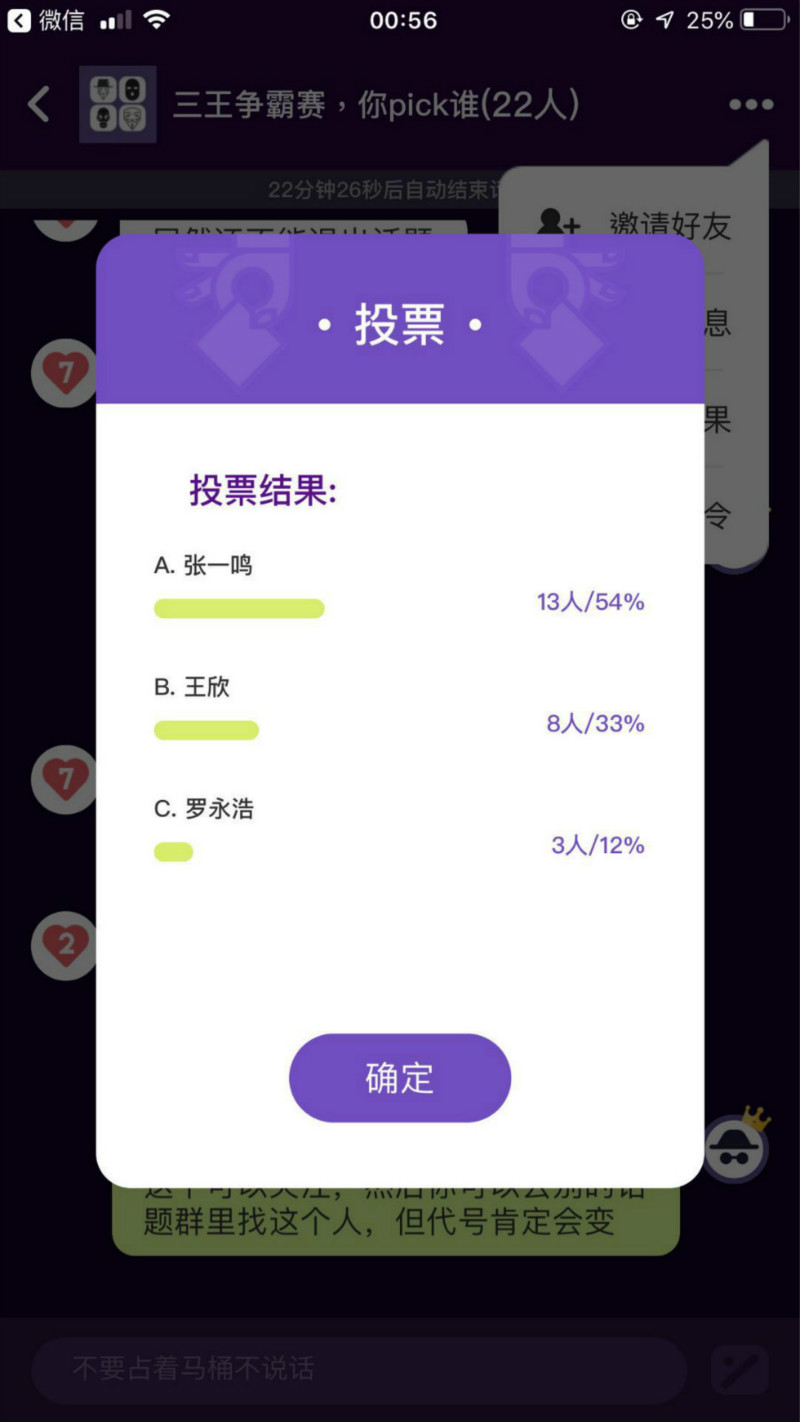 一小时内,该群共有24名用户参与投票,近半数用户参与讨论,所有用户在进入群聊后都会分配一个代号。其他用户可以点击头像关注该用户,但目前在企业版里尚未找到私聊入口。