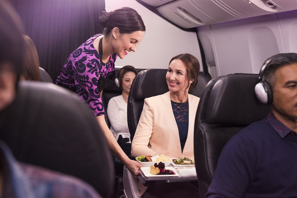 先说“吃喝”,开头提到的可以享受商务舱同等餐食的是新西兰航空没错了,可以享用到由新西兰国宝级大厨、融合菜系之父Peter Gordon和新西兰知名大厨Michael Meredith设计的精美菜肴,搭配新西兰获奖佳酿。
