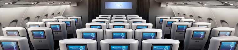 新型机舱以2-3-2阵式排列的独立客舱,座位间距超过96厘米,座椅宽约58厘米,几乎接近其他客机的商务舱座位;升级后的座位增加后仰角度,配备符合人体工学的头枕和重新设计的脚垫,能显著提升后仰时的舒适度。椅背上的高清触摸屏装配全新松下娱乐系统,尺寸比以往屏幕增加25%;共享的交流电源插座和独立LED照明,可以减少对其他乘客的干扰;每个座位皆备有两个USB电源插座和五个独立储物空间——对于长途旅行而言,你有很多件事想做,周围会堆着众多物件,有了独立储物空间,减少了东捡西掉的狼狈时刻。