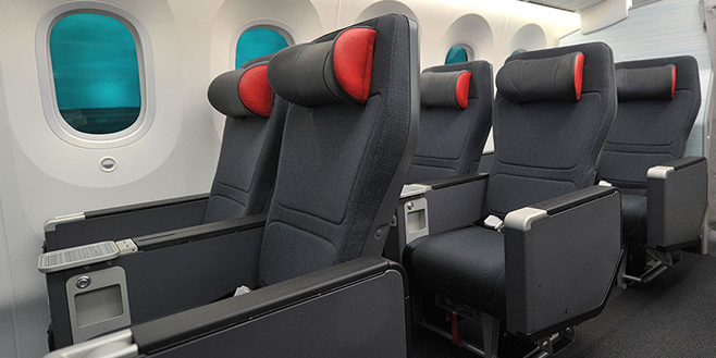 布局在尊享商务舱之后,经济舱之前的独立空间所提供的多项增值内容,服务于国人使用率频繁的长途线路:座位更宽阔——以目前配有豪华经济舱的两个机型为例,波音777-300和波音787-8的扶手间距分别为50.8厘米/20英寸、49.53厘米/19.5英寸,后倾角度增至17.8厘米;每个座位设有11英寸的电视屏幕和电源插座;享受优先办理登机手续与行李托运、登机等服务。此外,舱位乘客还可赚取125% Altitude定级里程和125% Aeroplan里程。