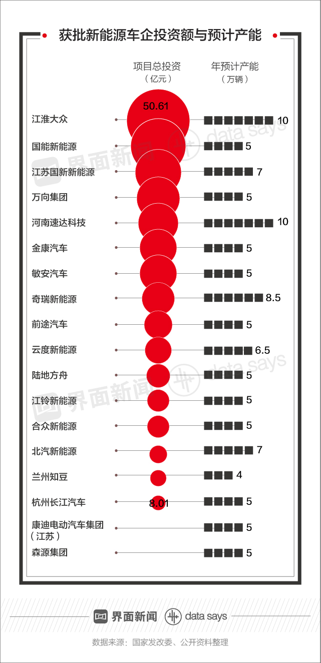 从项目投资和产能情况来看,获批新能源车企申报的项目总投资在8.01万至50.6万亿元之间不等,年预计产能以5万辆(纯电动乘用车)居多。