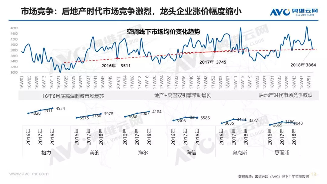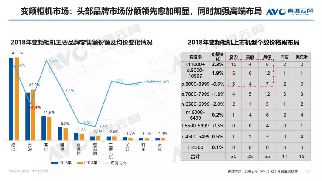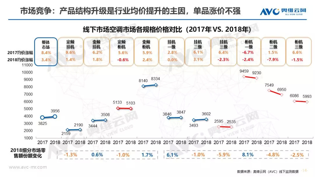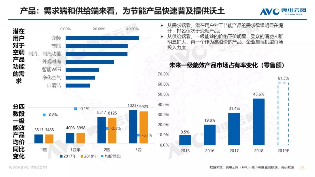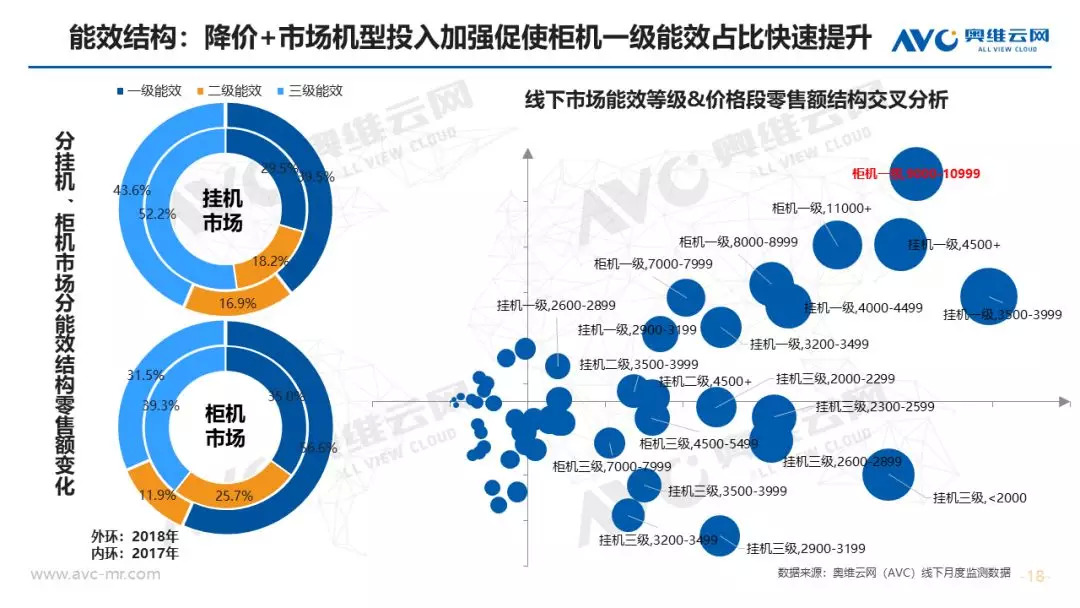 产品升级:除了变频、艺术化之外,节能产品是空调行业今年结构升级的重点,市场渗透率同比大幅度提升16.3%。从市场调研分析,未来潜在用户对于节能产品的需求欲望明显在提升,排名仅次于变频产品;从供给端看,一级能效的价格下价明显,受众的消费人群明显扩大,再一个作为高溢价的产品,在消费升级背景下企业主动加强市场机型投入力度,高能效机型个数占比提升明显。对于智能而言,市场上多数产品还是搭载智能WiFi模块为主,对于中级和高级智能产品,因受众小和价格高制约其发展。同时各大企业以解决用户产品痛点为出发点,打造自己特有的产品标签,市场表现亮眼。