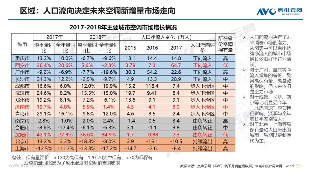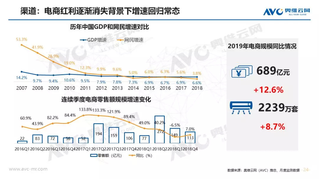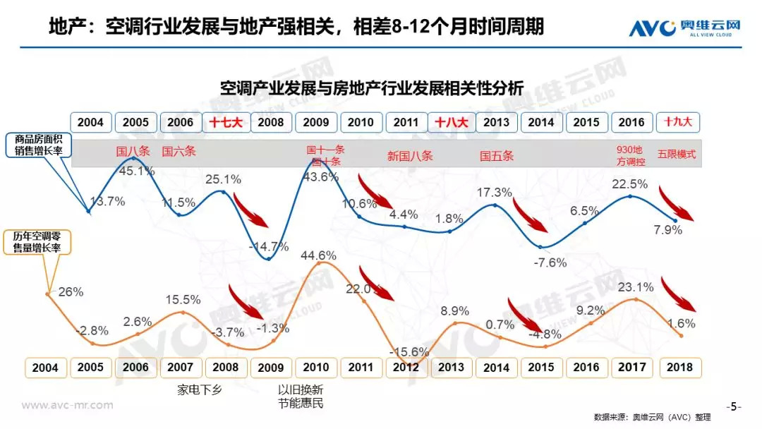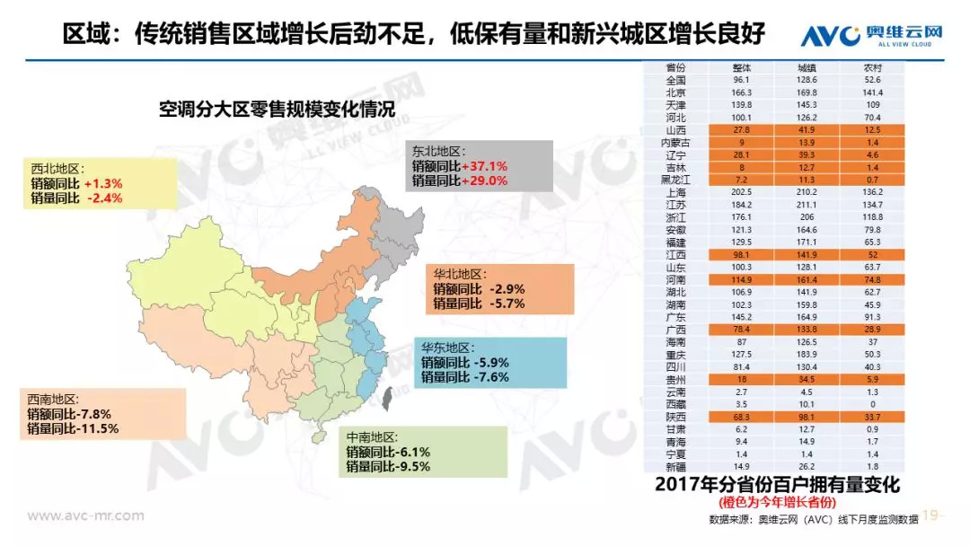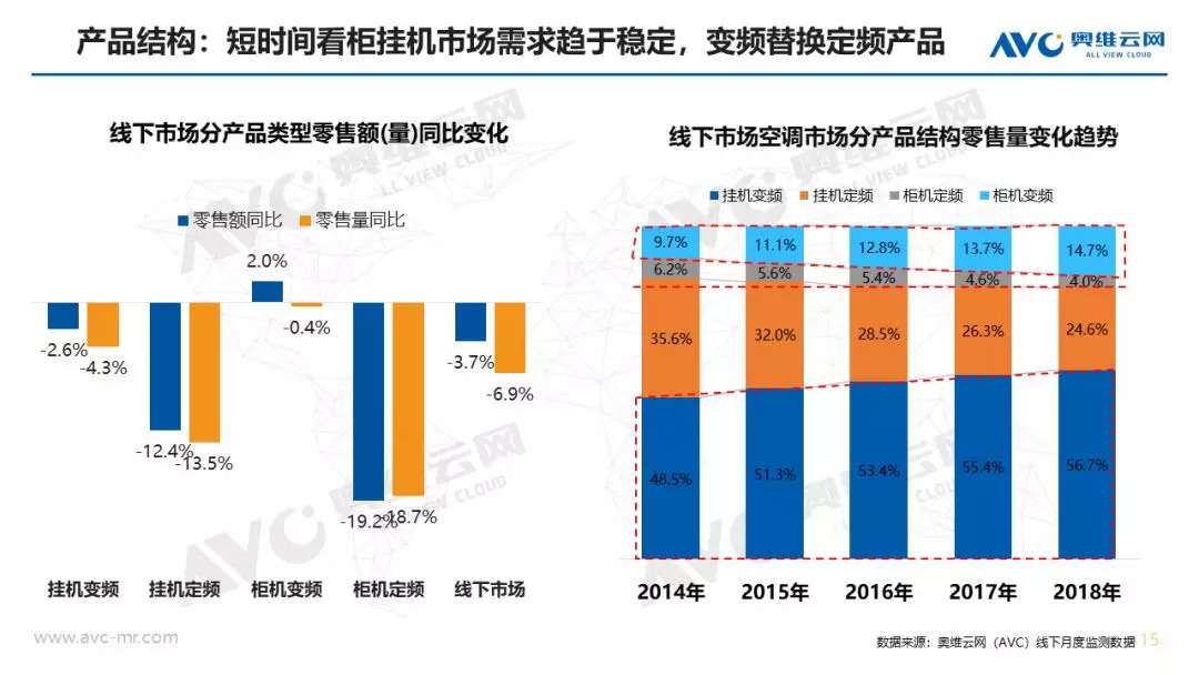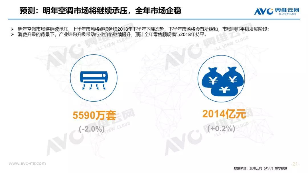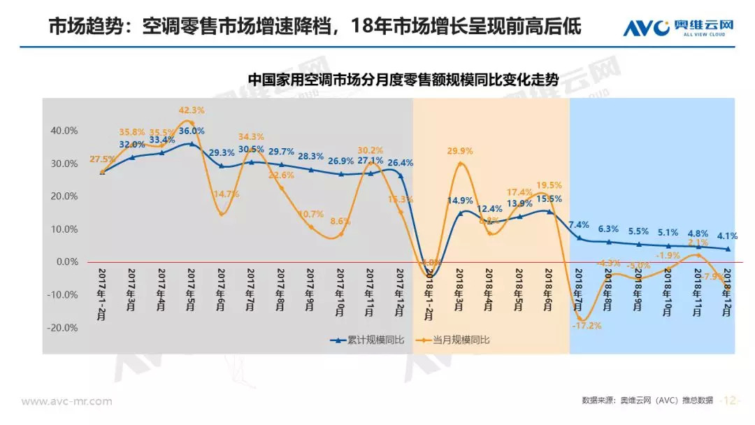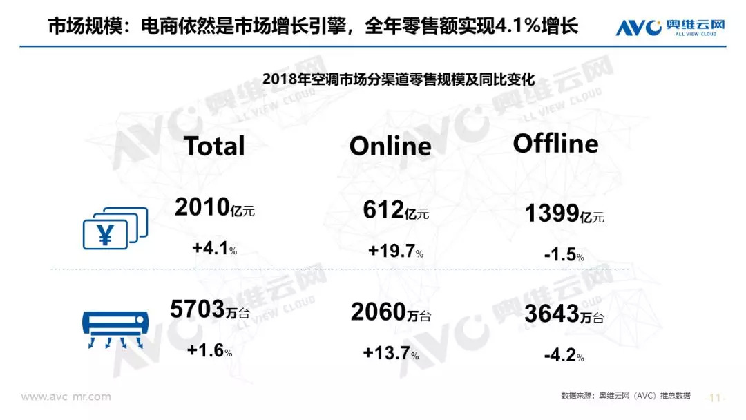 市场规模:在经济、地产等宏观环境不利的条件下,家用空调依然实现全年正增长,零售规模突破2000亿元大关。奥维云网(AVC)全渠道推总数据显示,2018年空调市场零售量规模为5703万套,同比实现1.6%增长,消费升级和产业结构升级背景下,零售额规模为2010亿元,同比提升4.1%。从市场增长趋势看,上半年市场零售额累计增长15.5%,7月份旺季受气温、降雨影响下市场增速急转直下,连续4个月市场同比下滑,11月份靠大促止步下跌,全年空调市场呈现“前高后低”走势。
