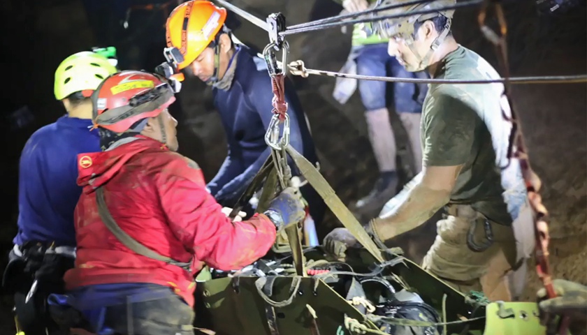 指挥中心的医疗队对诺特进行了身体检查,之后将他放在特质担架上,由救援人员接力传递、通过尚未灌满水的通道,最终把他送出洞外。
