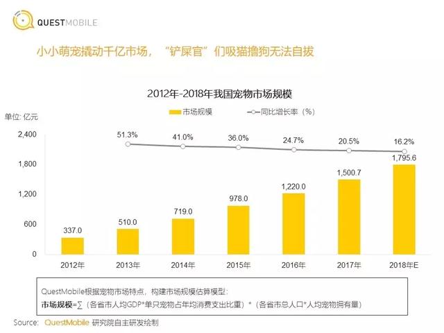 近日QuestMobile发布《2018年宠物行业洞察报告》,数据显示2018年整体宠物市场消费规模接近1800亿元,较2017年(1500亿元)增长20%。自2010年以来,国内宠物市场进入了高速发展阶段,每年保持20%-50%的复合增长率,预计到2019年左右,将达到2000亿左右的规模。庞大的宠物市场规模背后,是消费者对于陪伴的情感诉求。但本质来看,国内经济的高速发展,为宠物行业的兴起提供了不可或缺的经济基础。