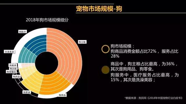 根据狗民网发布的《2018年中国宠物行业白皮书》可以看到,在猫狗宠物的市场分配情况中,宠物食品牢牢占据了半壁江山。而寄养业务相比较而言份额较小,这是由于宠物寄养业务具有一定的潮汐化需求。