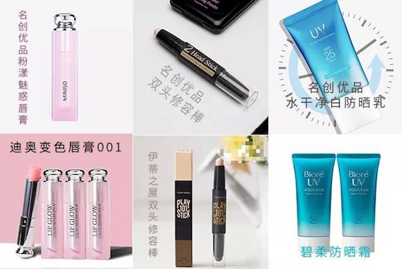 除了在各渠道大力推广外,名创优品在大量产品上效仿知名品牌设计,比如迪奥变色唇膏、碧柔防晒霜等,以 “平价代替”的标语堂而皇之地出现各社交平台KOL的更新中。蹭着大牌的热度,名创炒出了一个又一个爆款。