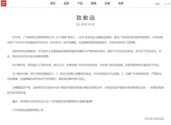 “感谢名创优品,让我经历了全部司法程序。”2018年10月,与名创优品打了两年的官司的插画家白关,终于等到了他们发布在官网的道歉。
