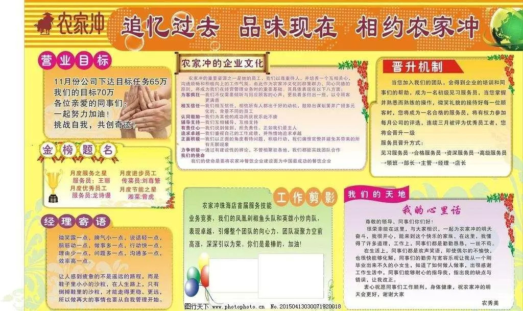 餐厅每个员工的生日都要出现在上面。可以做一个关爱板块,在员工生日的时候可以在关爱板块写一些祝福话语。