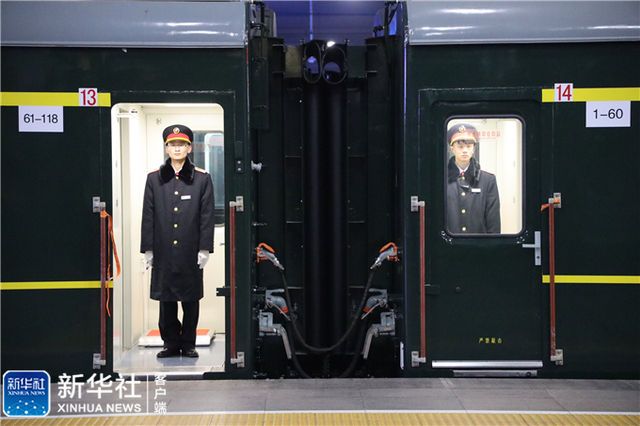 ↑1月21日凌晨,在北京站,工作人员在即将发车的北京至南通的K4051次列车上。新华社记者 邢广利 摄