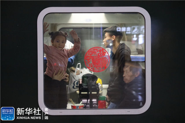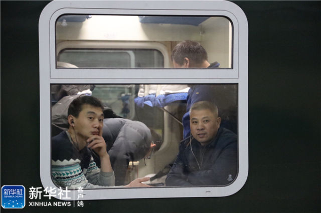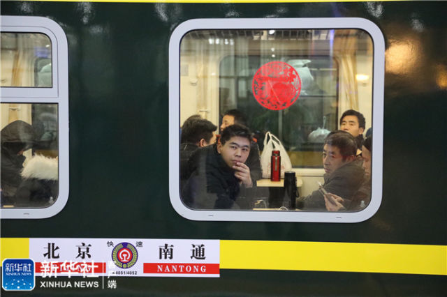 ↑1月21日凌晨,在北京站,旅客在北京至南通的K4051次列车上等待发车。新华社记者 邢广利 摄
