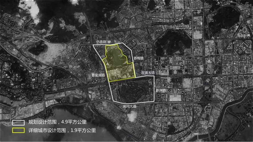 随后在2018年4月,深圳市规土委便发布了一份《关于香蜜湖片区城市设计国际咨询的公告》,向国内外征集香蜜湖片区的城市设计理念和方案,范围包括香蜜湖北、中、南三个片区,北至侨香路、南至滨河大道,西至香蜜湖路,东至香梅路、新洲路,面积约4.9平方公里。其中详细城市设计范围包括香蜜湖北区(不含现状居住区)、中区,面积约1.9平方公里。