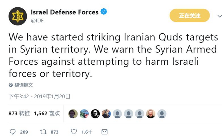 以色列国防军于1月21日在Twitter上发表声明,宣布对叙利亚的伊朗伊斯兰革命卫队圣城旅目标发动袭击。声明同时警告叙利亚政府军不要攻击以军及其控制区。