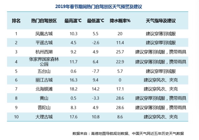 此外,春节期间大部分景区温度较低,指南对一些自驾热门景区的天气及穿戴提出建议。