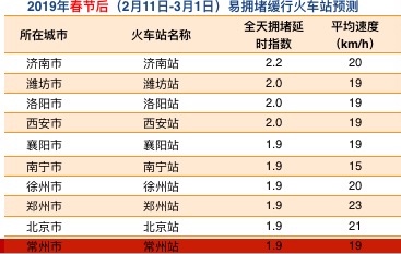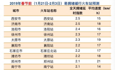 指南预测,在春节前(1月21日至2月3日)全国最易拥堵的火车站为西安站、济南站、洛阳站、徐州站等,春节期间则为桂林站、洛阳站、徐州东站,至春节返程期间,济南站的拥堵延时指数最高。乘坐列车需提前到达车站以防晚点。