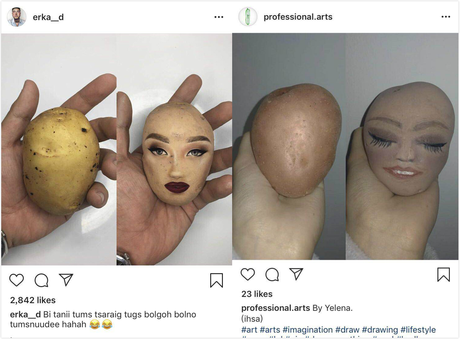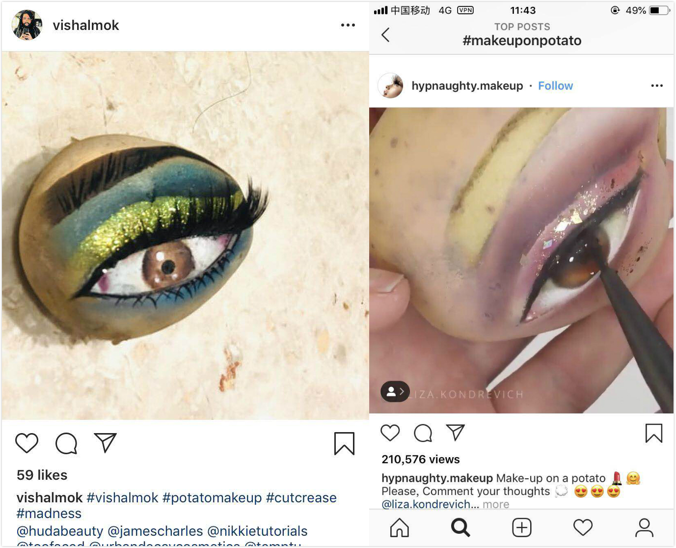 Balasyan的视频激发了许多人的创作欲,大家纷纷拿起了手边的土豆。很快,海外版抖音Tiktok、Instagram、YouTube等平台都出现了“makeup on potato(在土豆上化妆)”、“potato challenge(土豆挑战)”等热门话题。