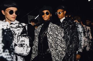 Balmain这一季全部采用黑白灰的色调,掺杂着少数的牛仔拼接。它将廓形更多的应用在了皮夹外套以及拼接款外套上,极简单的色调与不同质感的服装碰撞在一起,带来了不小的视觉冲击。